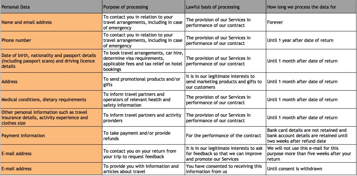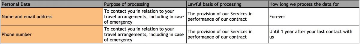 When you book your travel through Swoop Patagonia we collect certain personal information from you in order to be able to provide our Services to you. We set out in the table below the type of personal information we collect, the purpose for collecting it, the lawful basis for collecting it and the length of time we keep that information.